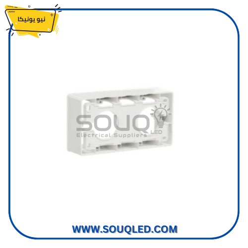 تركيب خارجي: تُستخدم هذه العلبة لتثبيت مفاتيح ومقابس سلسلة نيو يونيكا على سطح الحائط بدلاً من التركيب داخل الجدران، مما يجعلها حلًا مثاليًا للجدران الخرسانية أو في حالات التجديد.