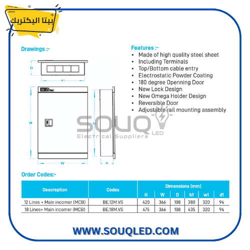 المنتج والماركة: تقدم لوحة توزيع كهرباء رئيسية نظام ٣ فاز بسعة ١٢ خط (١٢ مخرج)، وهي من إنتاج شركة بيتا إليكتريك المتخصصة تحت كود المنتج BE.12M.VS.LN.