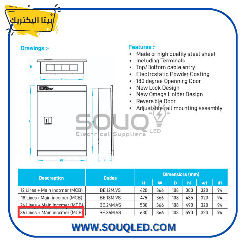المواصفات الأساسية: تحدد بأنها مزودة بمكان مخصص لـ قاطع عمومي (رئيسي) بالإضافة إلى ٣٦ خطاً فرعياً، وتصنع من بلاستيك هندسي فائق الجودة مقاوم للحرارة العالية والظروف الشاقة، وتتميز بتصميم داخلي واسع يسهل عملية تمديد الأسلاك وتنظيم الدوائر.
