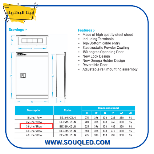 المنتج والماركة: تقدم لوحة توزيع كهرباء رئيسية عالية السعة بسعة ٣٦ خط (٣٦ مخرج) مرتبة في ٣ صفوف متوازية، وهي من إنتاج شركة بيتا إليكتريك الرائدة تحت كود المنتج BE.36M.HZ.LN.
