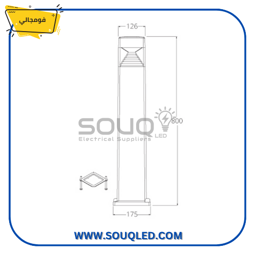 - المواصفات الاساسية: يحدد بأنه 10 وات LED، بلون إضاءة قابل للضبط (متغير)، وهيكل بولارد (عمود) طويل باللون الرمادي بارتفاع 800 مم.