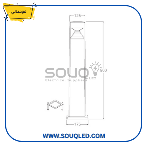 - المواصفات الاساسية: يحدد بأنه 10 وات LED، بلون إضاءة قابل للضبط (متغير)، وهيكل بولارد (عمود) طويل باللون الأسود بارتفاع 800 مم.